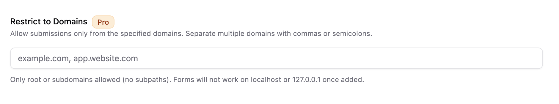 Only root or subdomain allowed. Once added forms will only work on the added domain and it will not work locally. So you must add this feature only after testing.&#x20;